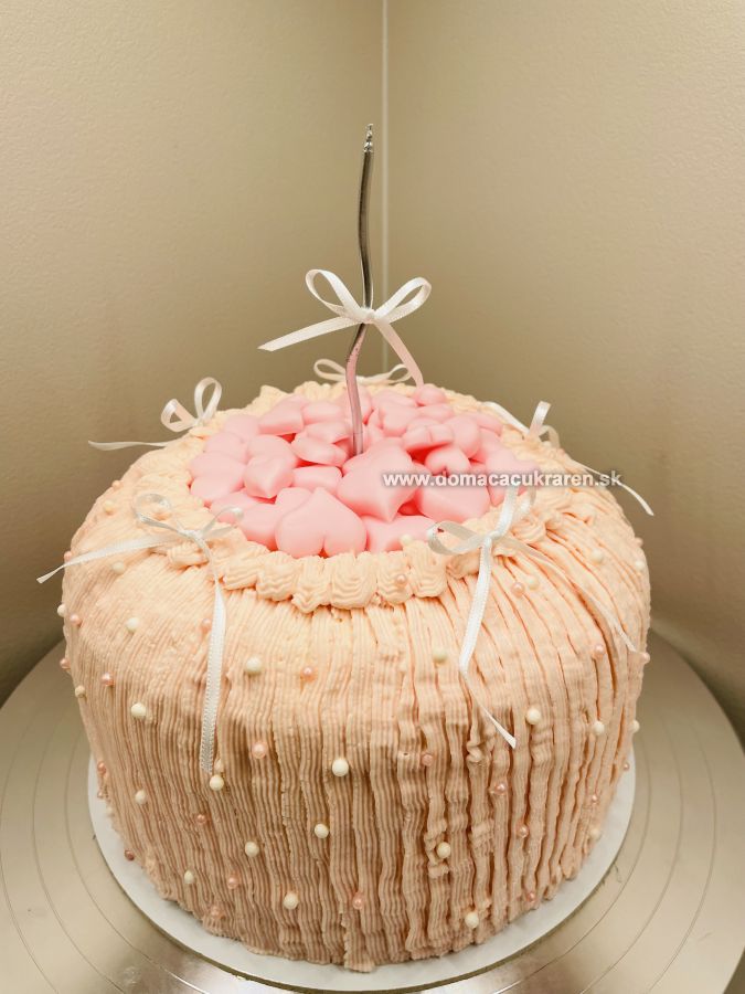 Torta je zdobená krémom, cukrovými perličkami, srdiečkami z poťahovej hmoty a stužkami. Priemer torty v spodnej časti je 24 cm.