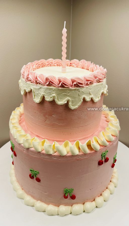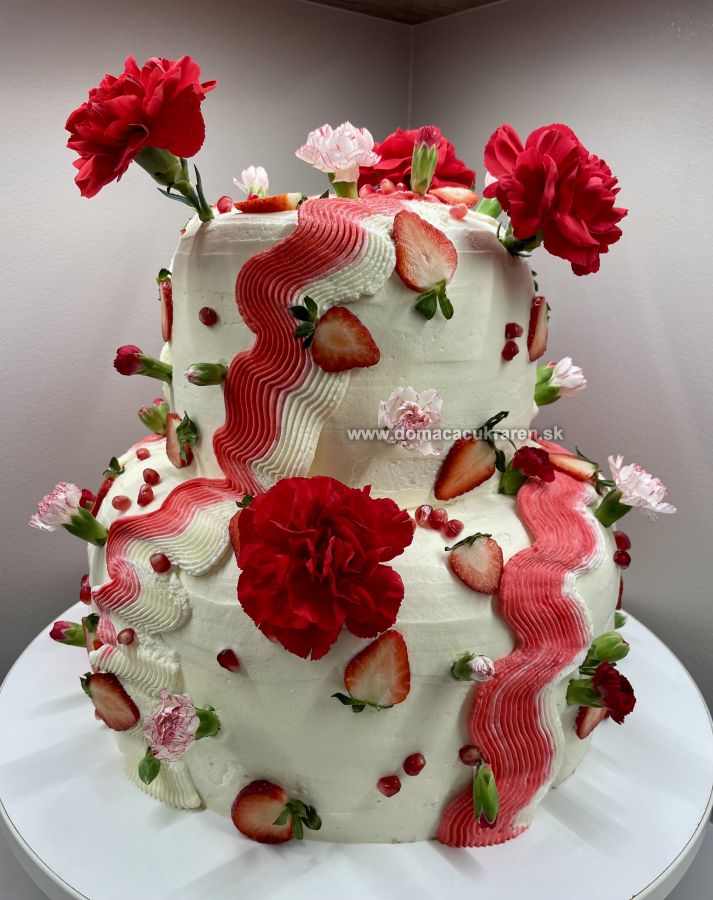 Torta je potretá s krémom, ozdobená ozdobami z krému. Priemer spodného poschodia je 24 cm. Záloha na podložku a výstuž vo vnútri torty je 20 E...