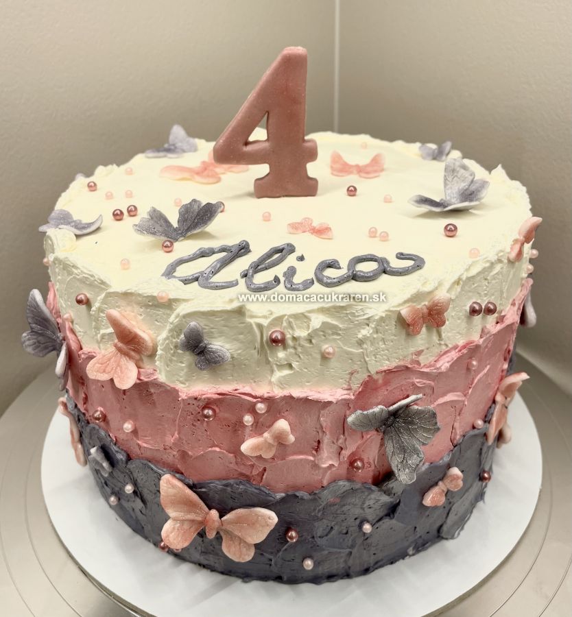 Torta je potretá s krémom, ozdobená ozdobami z poťahovej hmoty. Priemer torty je 24 cm.