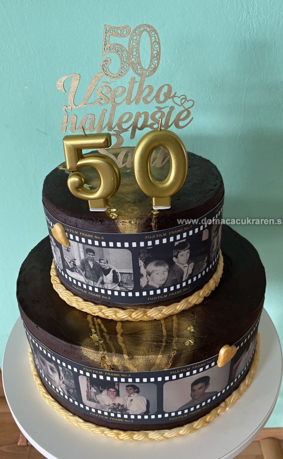 Torta je potretá s ganache krémom, zdobená filmovým pásom z jedlého papiera, ozdobami z poťahovej hmoty a z jedlého zlata. Priemer spodného poschodia je 36 cm. Záloha na podložku a výstuž vo vnútri torty je vo výške 20 EUR. Filmový pás, aj ozdoby na torte vo fotogalérii, si dodala zákazníčka, cena torty je bez tohto príslušenstva.