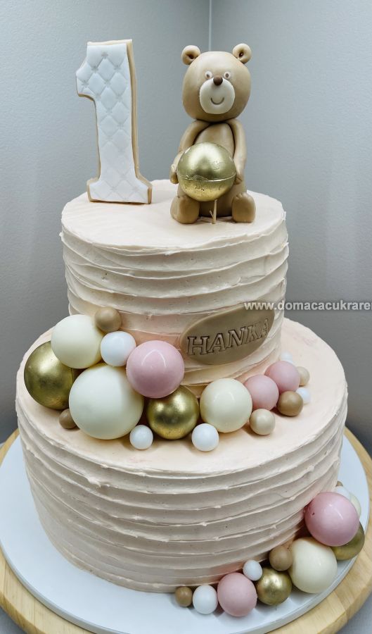 Torta je potretá s krémom, zdobená je ozdobami z poťahovej hmoty a guľkami z čokolády. Priemer spodného poschodia je 28 cm. Záloha na podložku...